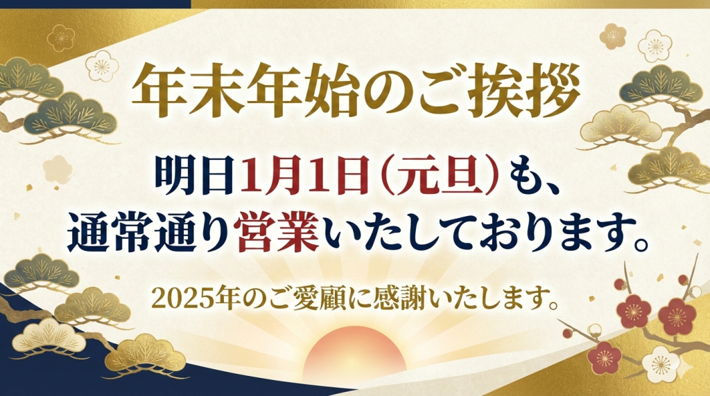 明日1月1日(元旦)も、通常通り営業いたしております。